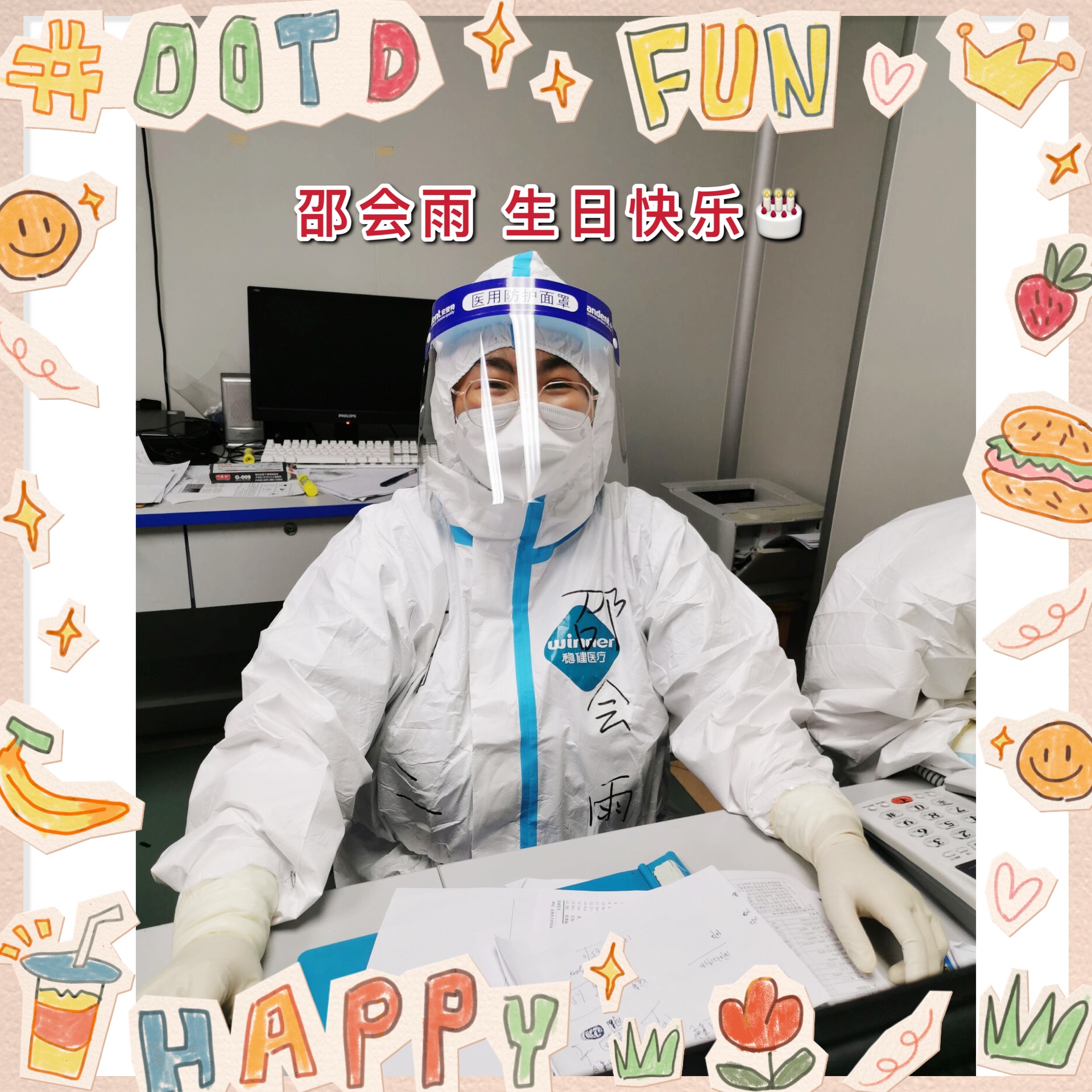 1月14日,是我院增援胸科医院医疗队领队、副院长崔炜的生日。自1月10日带队进入胸科医院后,他一心扑到防疫一线的患者救治工作中,率先进入ICU组,对重病患者进行诊治。14日生日当天,他如往常一样,一直在患者床旁、病区、会议室等地穿梭,还要不停对各医疗组上报上来的问题进行解决、协调,随时指导调整进一步诊治方案。深夜,医疗队的成员们见崔院长迟迟未归,心疼又感动,偷偷准备了一份生日惊喜。