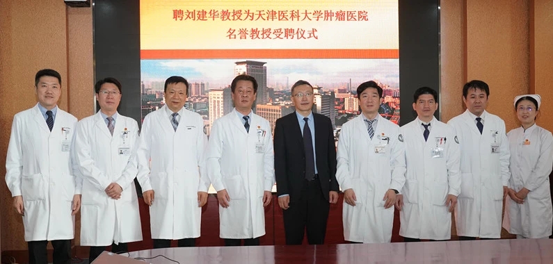 郝继辉院长向刘建华教授颁发聘书。刘建华教授正式受聘为天津医科大学肿瘤医院名誉教授。