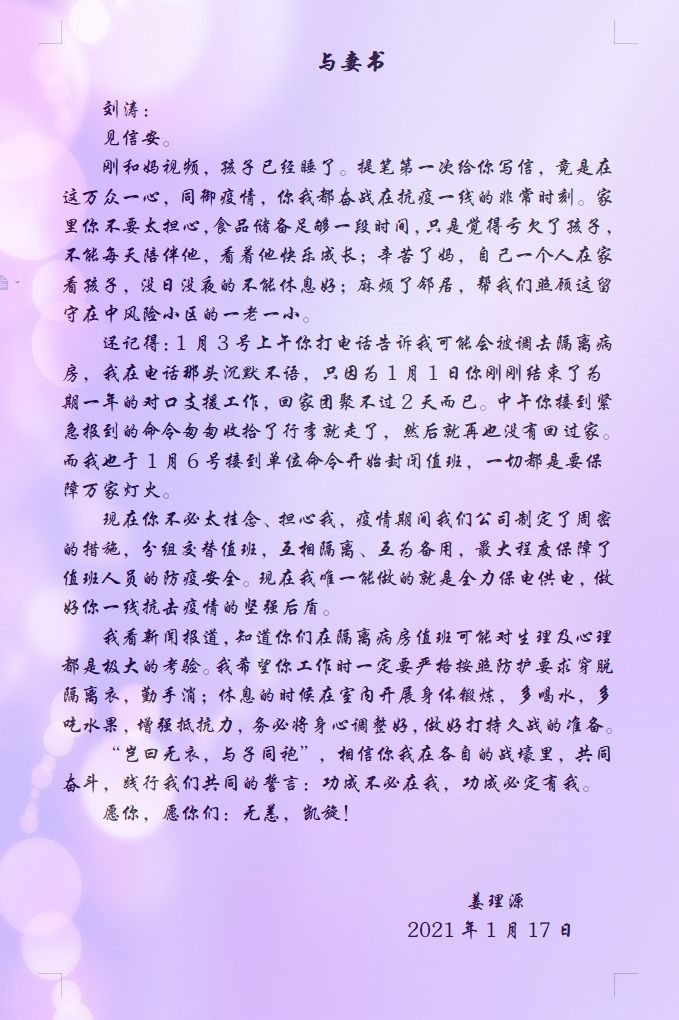 东院区心内一科主治医师刘涛,自疫情发生后,和无数二院人一样,并肩投身到抗击疫情一线的工作中。不久前,被紧急抽调到本部感染科隔离病房进行支援。刘涛的爱人就职于省电力局,也在单位坚守岗位,保障全省正常供电。当得知妻子进入隔离病房后,他将万千叮嘱汇集成了一封深情家书。