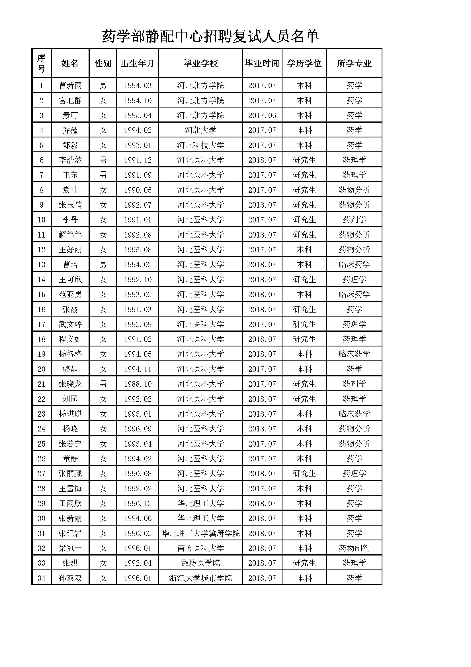 根据医院药学部静配中心工作人员招聘计划及笔试成绩,共有34人通过了笔试进入复试程序,具体名单见附表。医院定于8 月20日(下周一 )上午8:30~10:00进行复试。