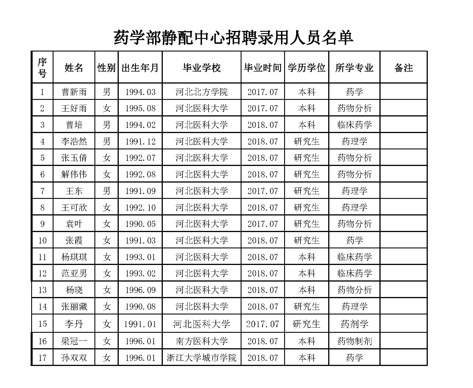 根据医院医院药学部静配中心工作人员招聘计划及招聘条件,经对应聘人员进行笔试、面试及复试程序,根据考试成绩,医院决定拟聘用以下17人,具体名单见下表,请以下人员于8月25日早7:00到医院体检中心(北院区4楼)查体,并于9月3日上午8:00到医院图书馆三楼会议室报到。