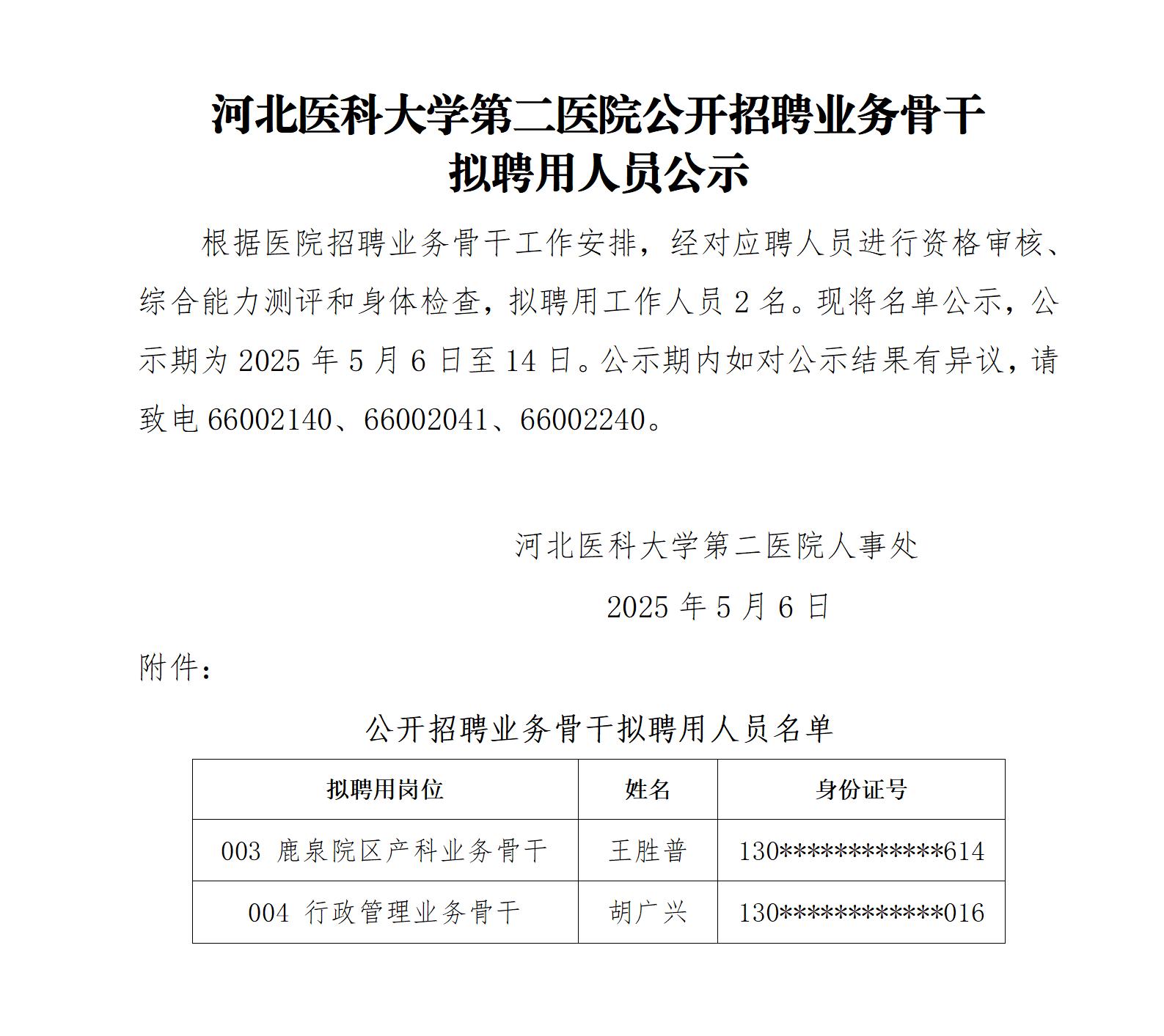 河北医科大学第二医院公开招聘业务骨干拟聘用人员公示