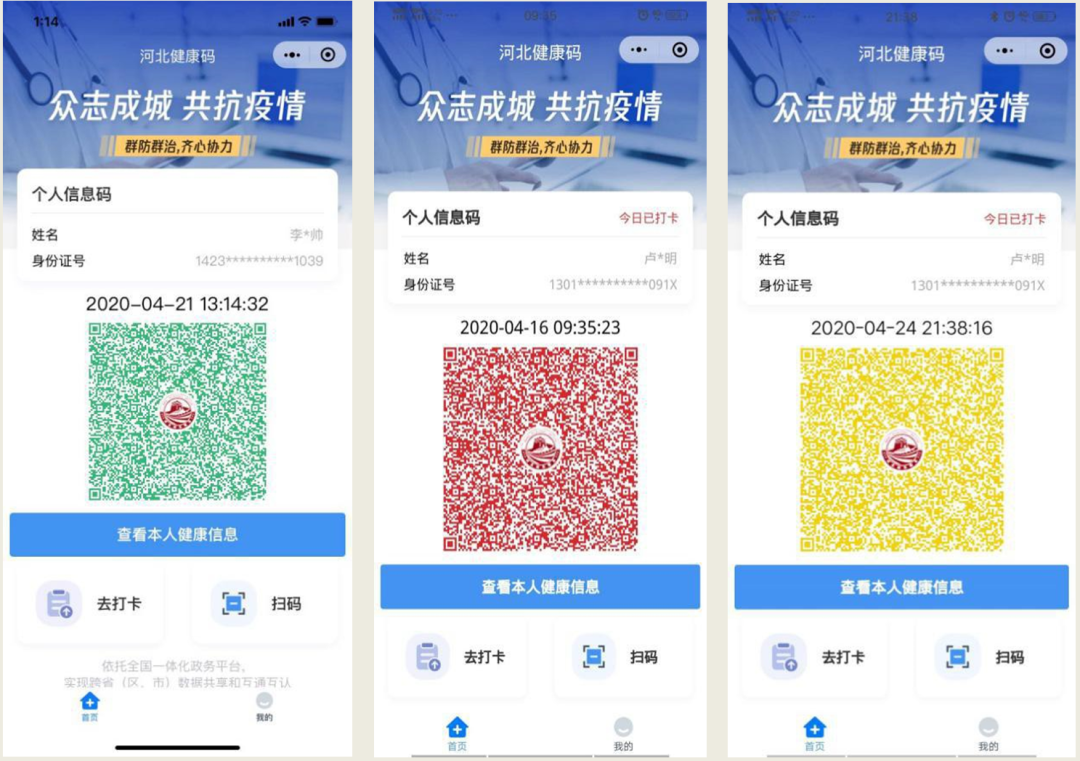 “河北健康码”由省应对疫情工作领导小组办公室统筹部署,省政务服务办提供技术平台支持,依托全国一体化政务服务平台汇聚的国家相关部门疫情防控数据,为民众提供健康核验服务。