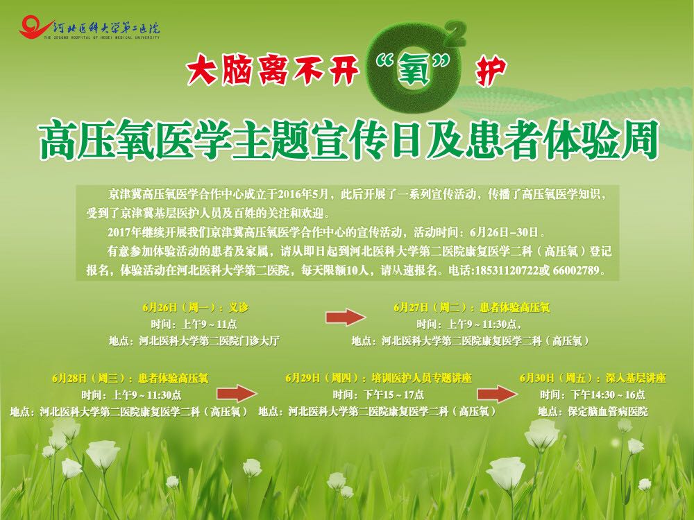 有意参加体验活动的患者及家属,请从即日起到河北医科大学第二医院康复医学二科(高压氧)登记报名,体验活动在河北医科大学第二医院,每天限额10人,请从速报名。电话: 18531120722或 66002789