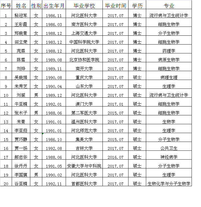 根据医院专职科研人员招聘方案,经对应聘人员的资格审查,以下20人(名单见下表)符合医院招聘条件,请以下人员于5月11日上午8:30到医院行政楼425会议室参加面试。面试人员请准备好PPT,介绍本人的研究项目及相关情况,时间不超过5分钟。