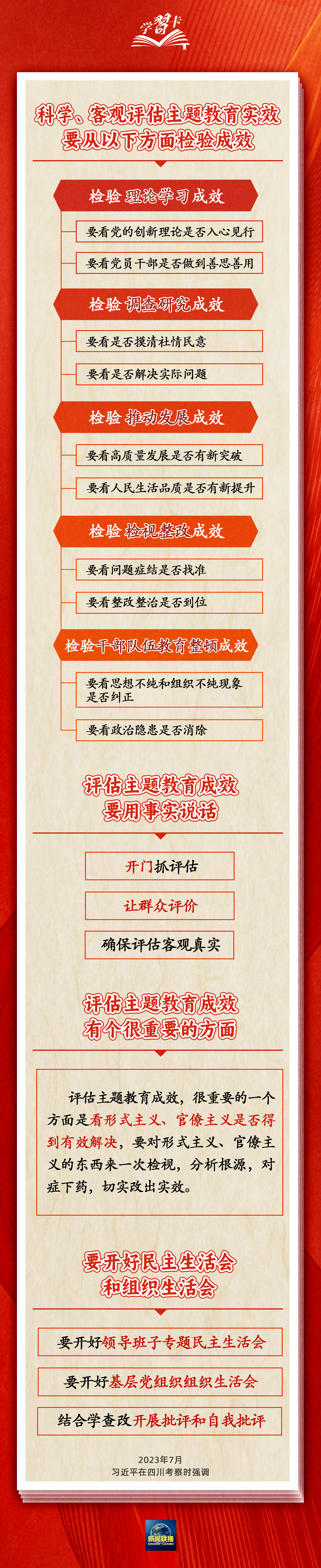 当前,全党正在深入开展学习贯彻习近平新时代中国特色社会主义思想主题教育。7月25日至27日,习近平总书记在四川考察时强调,第一批主题教育只剩下一个多月时间,各级党组织要落实党中央部署,善始善终、慎终如始,务求实效。要对主题教育的实效进行科学、客观评估。