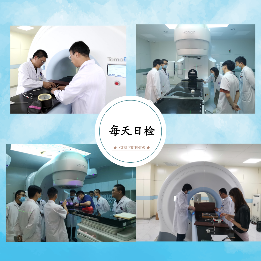 “晨检质控”是放射治疗师们开启每日工作常规的第一步,每天早上开机后,都要对治疗机及其附属配件进行检测。通过坐标纸及MPC工具对加速器本身的机械系统进行检测,无误后再对治疗系统进行检测。用电离室检测治疗机的输出剂量,再根据当天的室温、气压计算绝对剂量,确保加速器的照射剂量准确无误。认真做好每日晨检记录,用良好的设备质量控制来保障放疗质量!
