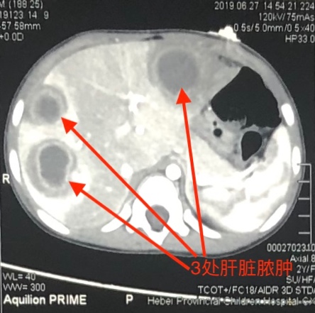 经过多科室协商决定,在患儿入院第二日进行了肝脓肿穿刺引流冲洗手术,麻醉科李晓松主任医师对患儿进行基础麻醉,并严密监测各项生命体征,超声科田晖主任医师予以超声定位,精确描绘出肝脏内三处脓肿的大小、位置、毗邻血管及胆管,并在体表标记穿刺点,详细指明穿刺方向和穿刺深度;小儿外科孙驰主治医师在超声引导下将穿刺针准确刺入肝内脓腔,分别对肝脏多发脓肿进行穿刺引流、脓腔冲洗术,共计抽出脓液约30ml,手术过程顺利,用时20分钟。超声监测显示脓腔内脓液全部被抽出,且肝内大血管及肝内胆管未受损,腹腔内未见明显出血,待患儿麻醉清醒后平安返回病房。术后患儿体温迅速下降至正常,未再发热,患儿腹痛消失,手术当天恢复进食,患儿各项感染指标也逐步恢复正常,复查肝脏超声提示脓肿基本吸收,患儿现已康复出院。