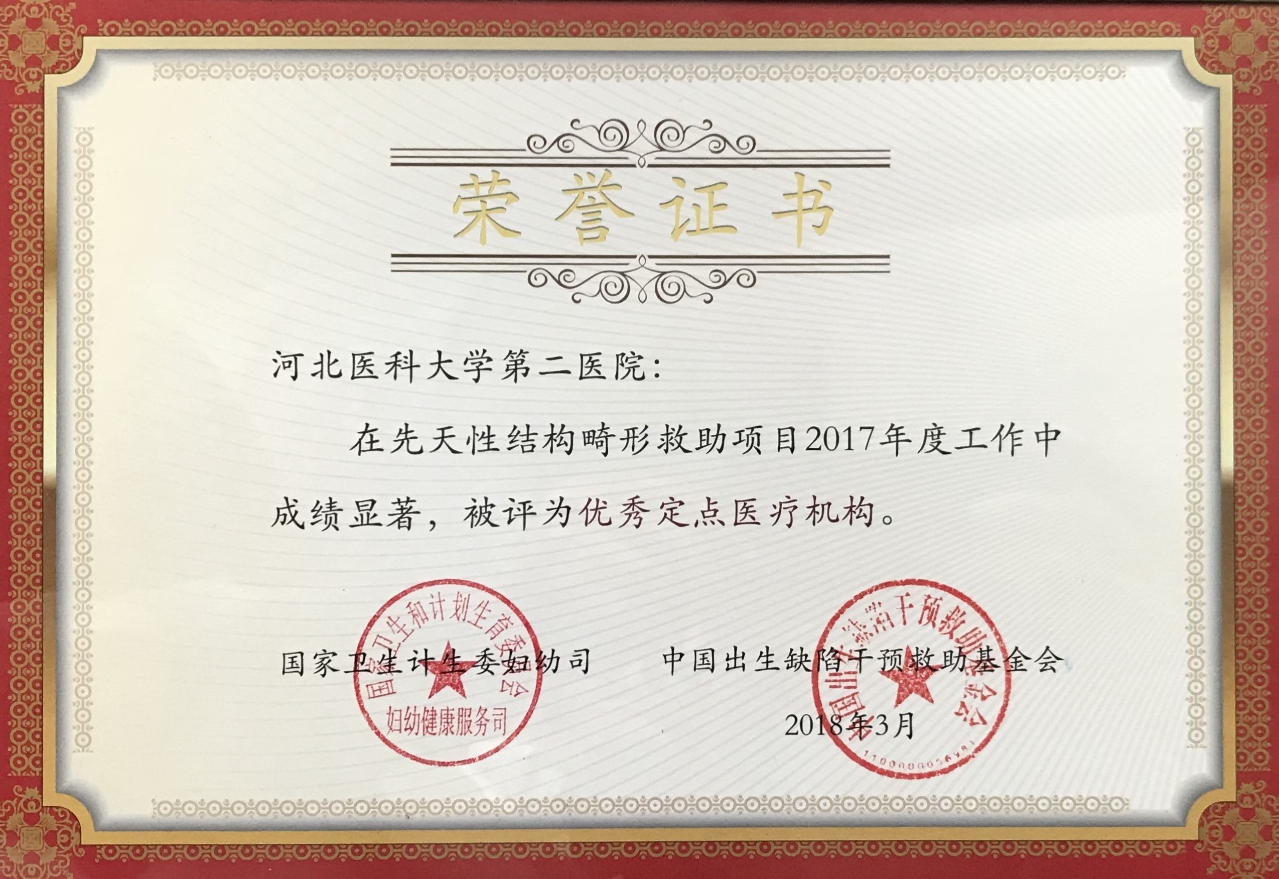 2017年度先天结构畸形救治工作获得国家卫计委妇幼司表彰