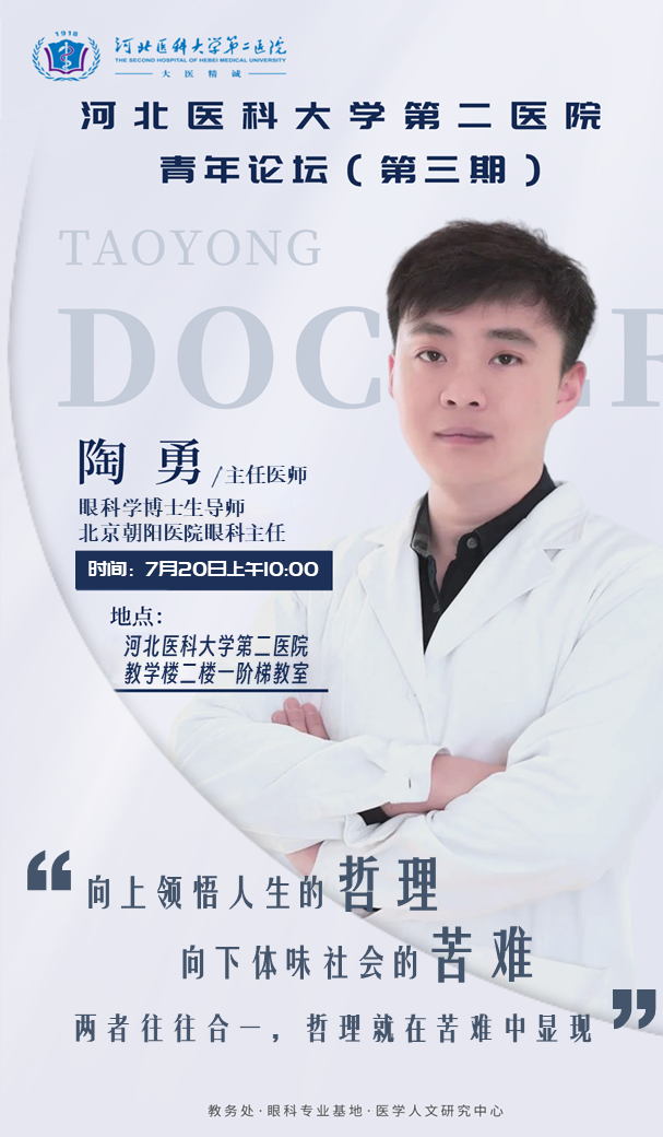 为牢记医者初心,坚定新时代青年医师和医学生的理想信念,7月20日,我院特邀首都医科大学附属北京朝阳医院眼科主任陶勇教授做客第三期河北医科大学第二医院青年论坛。 党委书记王贵英参...