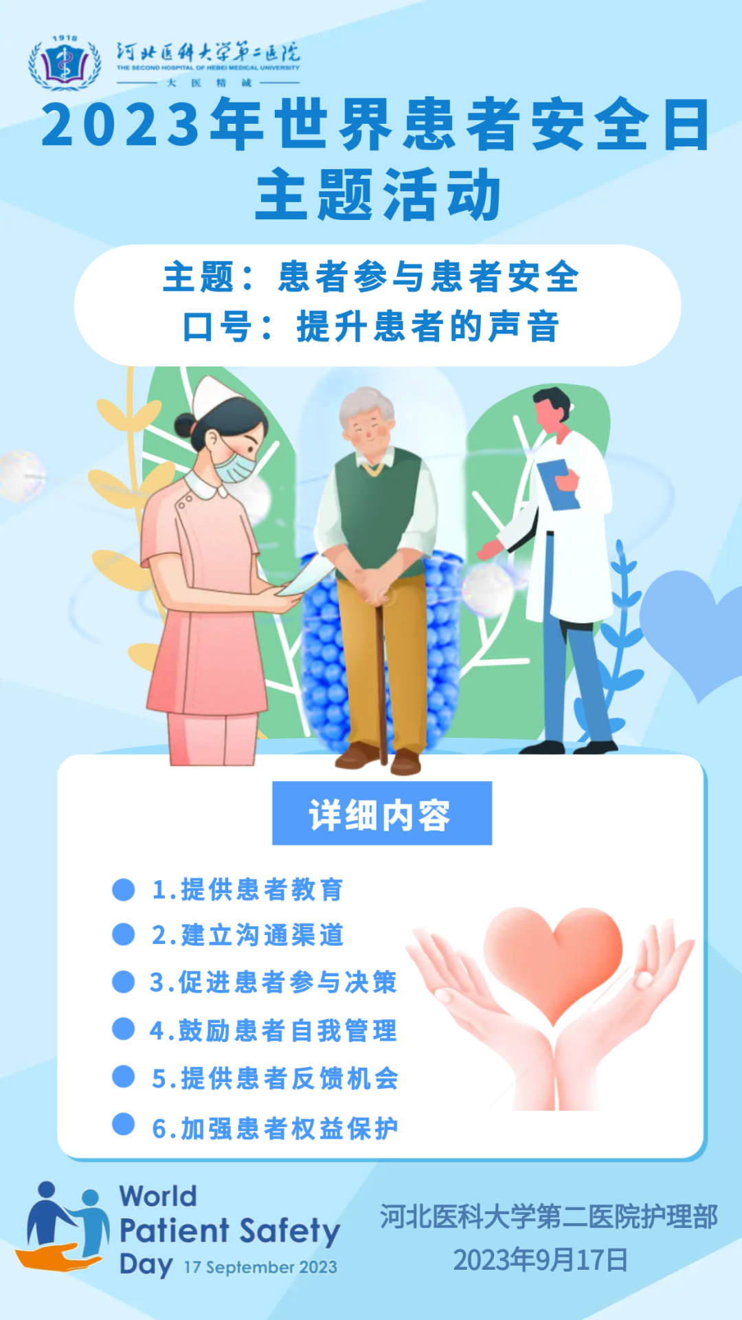 2023年9月17日是第五个世界患者安全日,今年的主题为“患者参与患者安全”,口号是“提升患者的声音”。 为提高患者及家属、照护人员在诊疗过程中的参与度,连日来,我院护理部全面部署,积极开展了海报制作、健康宣...