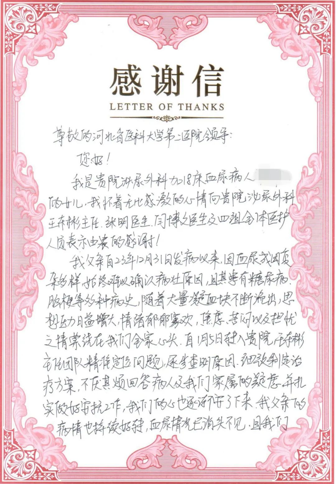 近日,我院泌尿外科收到一封来自患者家属梁女士的感谢信,真挚诚恳的话语尽显对我院医护人员的敬佩和感谢。 因血尿成因复杂,且患者伴有多种病史,梁某自发病以来辗转多家医院,始终难以...