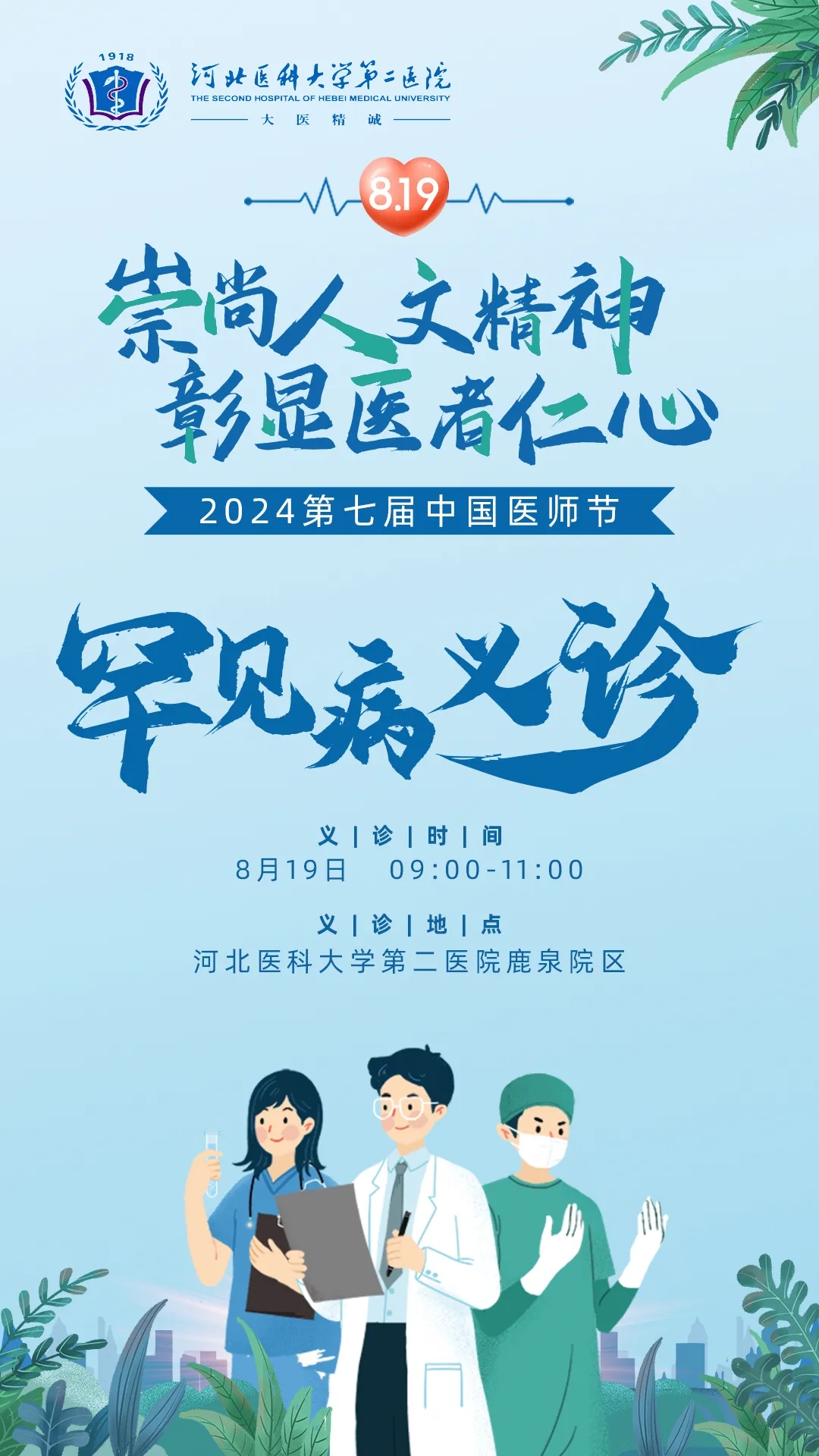 中国医师节是每年的8月19日,设立此节日旨在激励广大卫生与健康工作者大力弘扬“敬佑生命、救死扶伤、甘于奉献、大爱无疆”的崇高精神。 2024年8月19日是我国第七个中国医师节,为庆祝中国医师节,弘扬“敬佑生命...