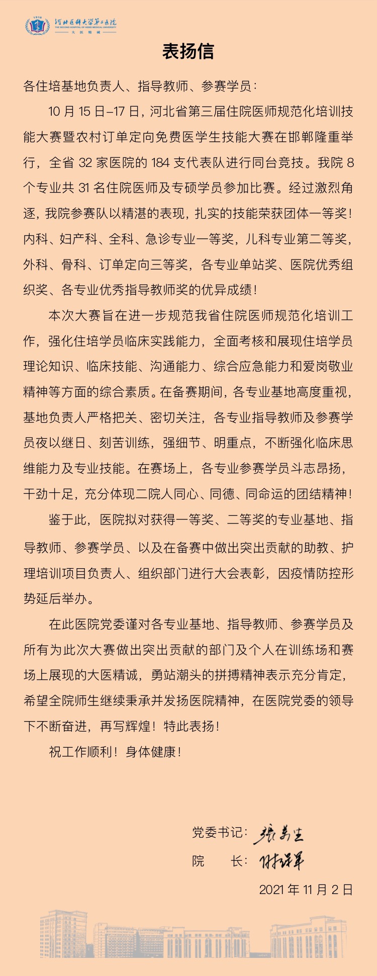 10月15日-17日,河北省第三届住院医师规范化培训技能大赛暨农村订单定向免费医学生技能大赛在邯郸隆重举行,全省32家医院的184支代表队进行同台竞技。我院8个专业共31名住院医师及专硕学员参加比赛。经过激烈角逐,我...